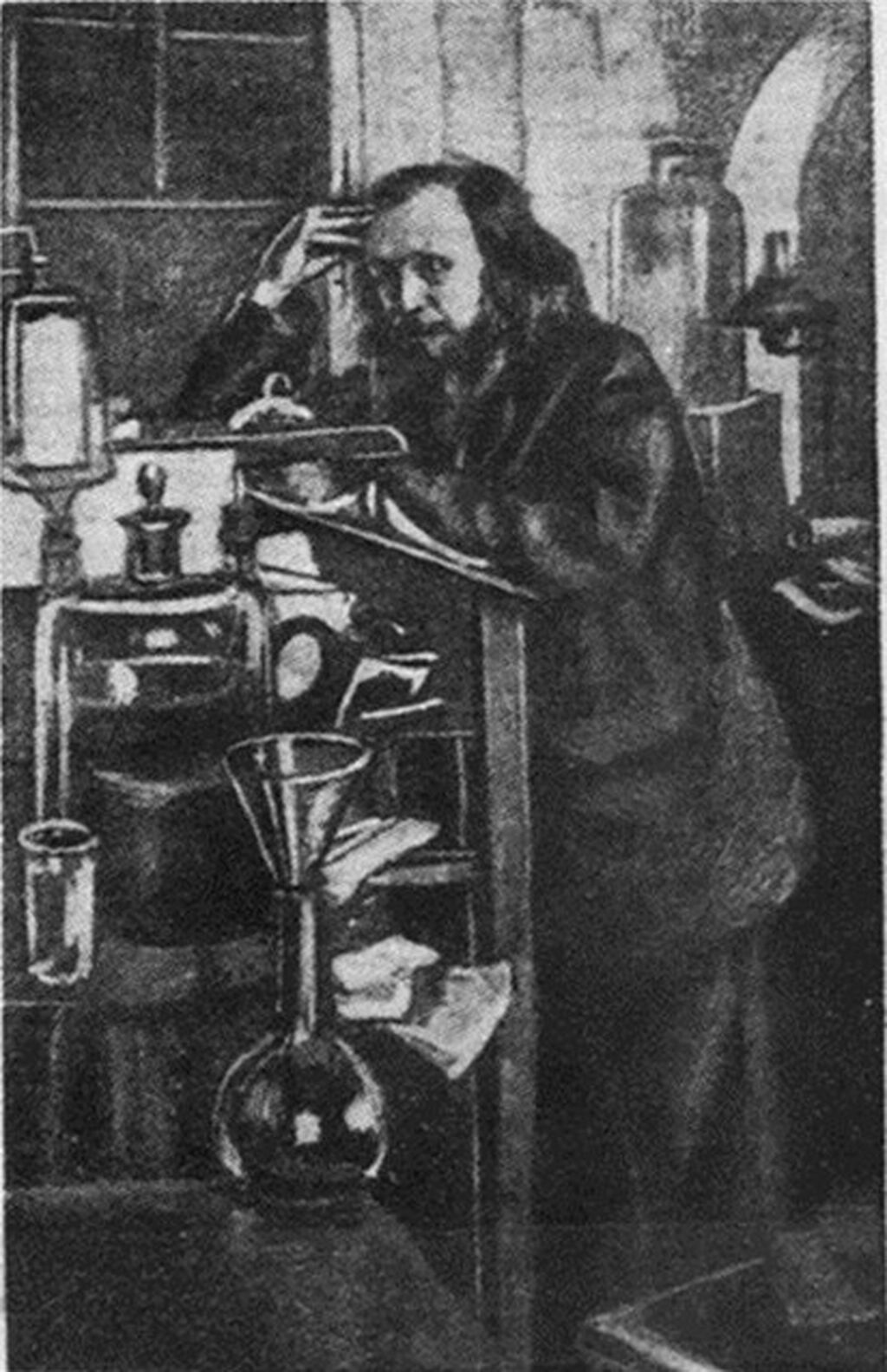 Д. И. Менделеев в лаборатории. 1886 г. (С картины Н. А. Ярошенко).