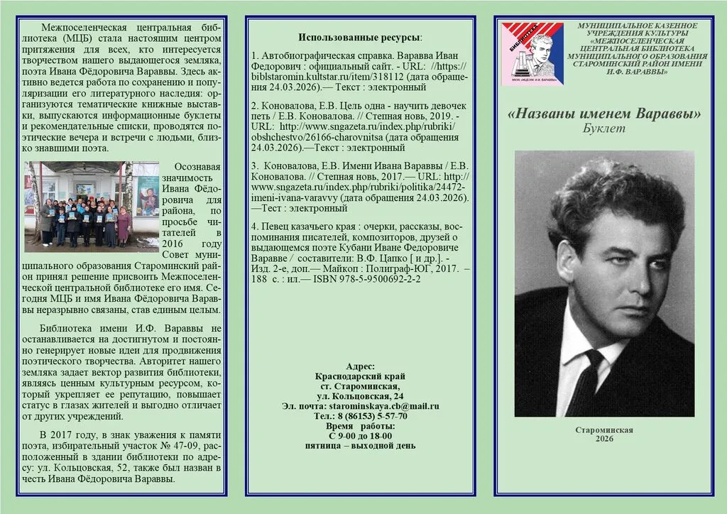 Мы, его потомки, отвечаем Ивану Фёдоровичу взаимной любовью и уважением. В Староминском районе его имя носят несколько учреждений, и наша библиотека – одна из них. Подробнее об этом можно узнать из буклета «Названы именем Вараввы», подготовленного заведующим краеведческим сектором А.Г. Литовкой.